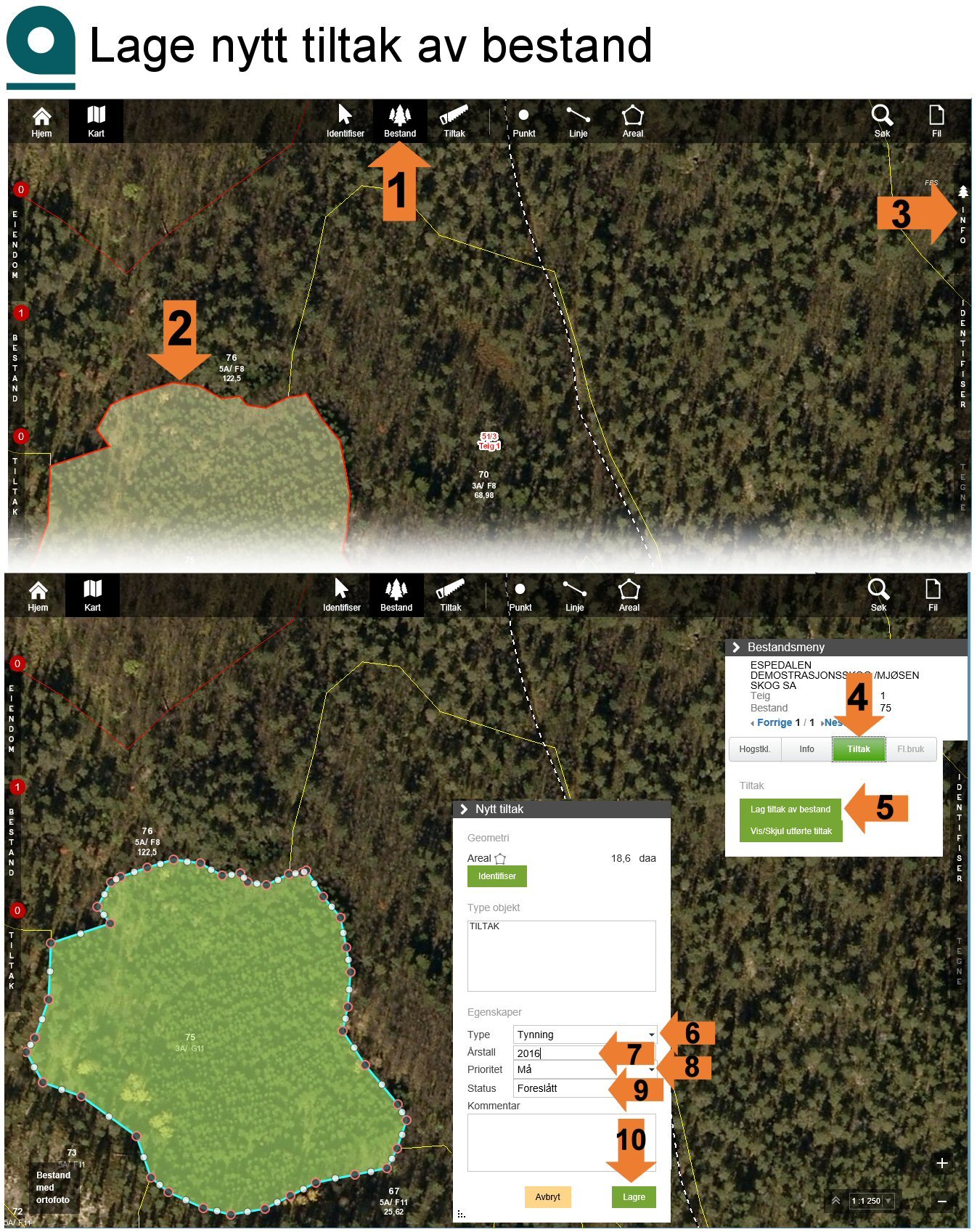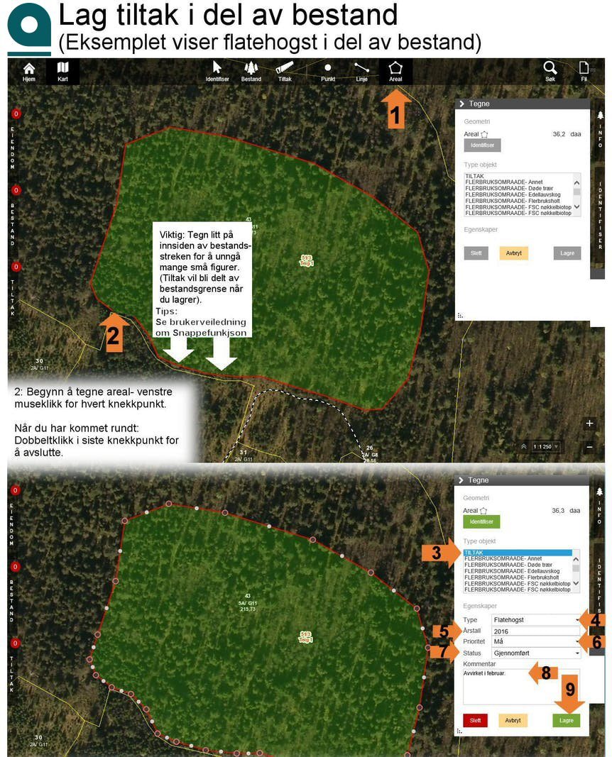 Derfor: Tiltak i ALLMA er nå fullt ut redigerbare for deg som ALLMA-bruker. Dvs du kan endre egenskaper, lage nye som dekker hele bestand, lage nye som dekker deler av bestand og du kan slette tiltak. Alle endringer du gjør er umiddelbart søkbare.